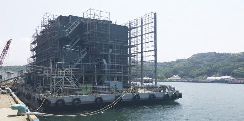 バージ上での上構組立作業